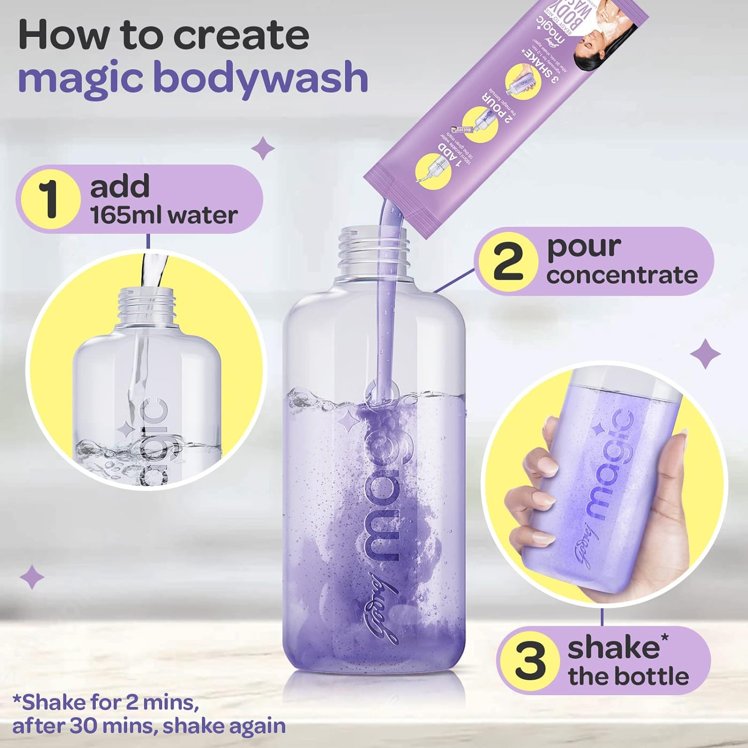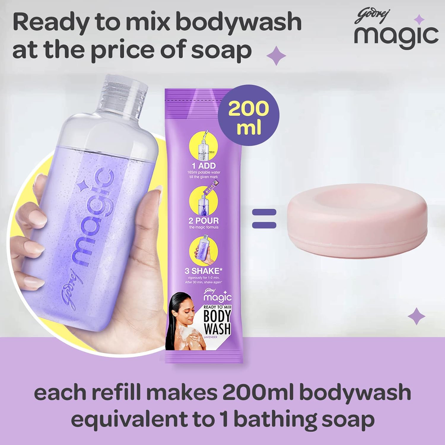 Contains: Godrej Magic Ready-To-Mix Body Wash 1 Bottle & 1 Refill (makes 200ml of bodywash)