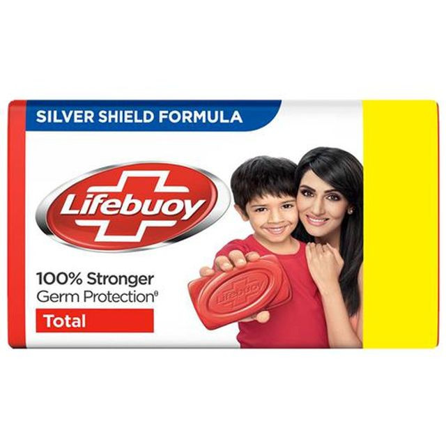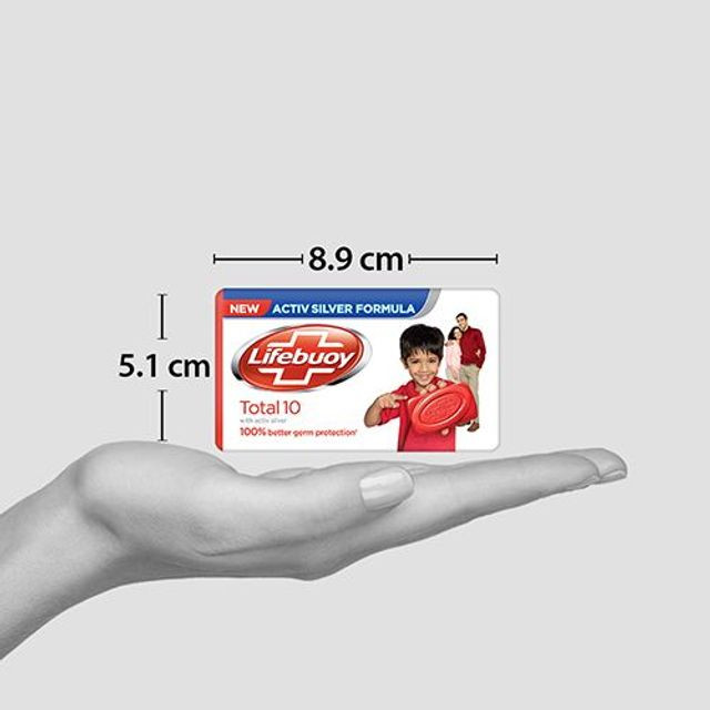 The Lifebuoy Total Soap Bar offers complete germ protection for you and your family. It is Worlds No. 1 selling germ protection soap. It is powered with Activ SILVER, one of natures most powerful ingredients that helps fight infection-causing germs. So give your family 100% better germ protection with Lifebuoy soap. Bathe regularly, that is, wash your body often after intervals that suit you with Lifebuoy soap with Activ silver which gives you protection from 10 infection causing germs. It has been proven that handwashing can help avoid numerous illnesses, it is one of the most effective ways of preventing you and your family form common illnesses, which are usually caused by invisible germs. These invisible germs on your hand enter your body while eating food and then may cause stomach infection. Using Lifebuoy soap, to wash your hands every time before eating, helps remove these germs and hence stay protected from illnesses causing germs. Buy Lifebuoy Total Soap Bar in its pack of 4, now! It is available in 4 variants: Total 10, Care, Nature, Lemon fresh variants. Also available in the following pack sizes: 125g single bar. Also try Lifebuoy Superfast HandWash which gives you 99.9% percent germ protection in just 10 seconds (as per lab test and on indicator organism). Features and Bullet Points • Lifebuoy Total comes with power of Activ Silver • Best ever protection from 10 infection causing germs • Have clean, soft skin & a germ-free bathing experience with Lifebuoy Total germ protection soap bar • Worlds No. 1 selling germ protection soap • Approved by Royal society of Public health